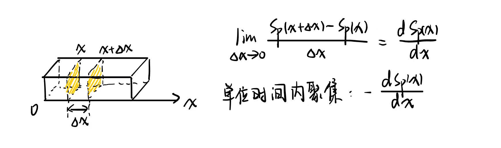 现在我们要推导在单位体积内流入载流子的数量。假设存在一个一维晶体,横截面积为单位面积,在$x$处有流入的载流子,在$x+\Delta x$处有流出的载流子,则$\Delta x \rightarrow 0$时,根据积分的概念,流出这个晶体的载流子数量为: