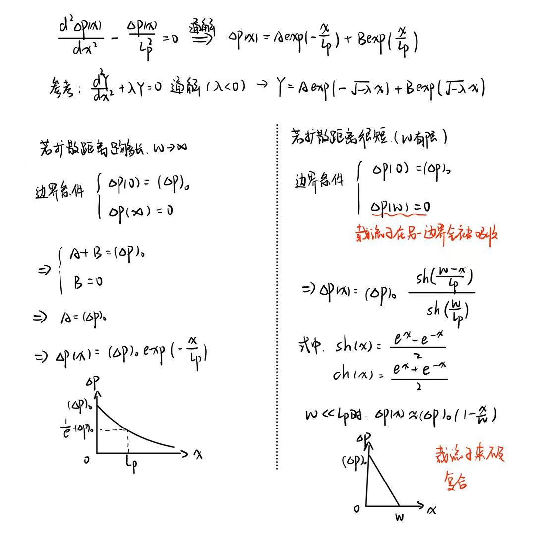 扩散电流,顾名思义是载流子的扩散作用引起的电流,在半导体中我们通常仅关心非平衡少子的扩散(半导体的一端受到特定波长的光的持续照射,光生载流子持续产生)。分析扩散电流的最终目的是:通过求解非平衡少子$\Delta p(x)$的表达形式(N型半导体),就可以求出扩散电流的具体表达形式。